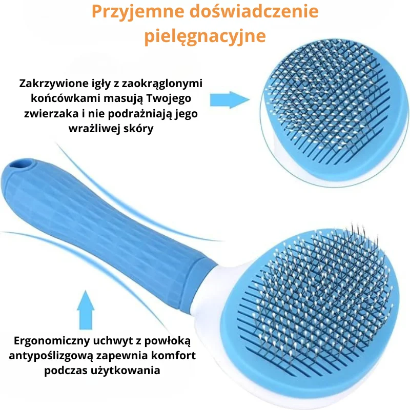 - Szczotka nie tylko usuwa luźne włosy i brud, ale także masuje skórę, poprawiając krążenie i dodając blasku sierści.